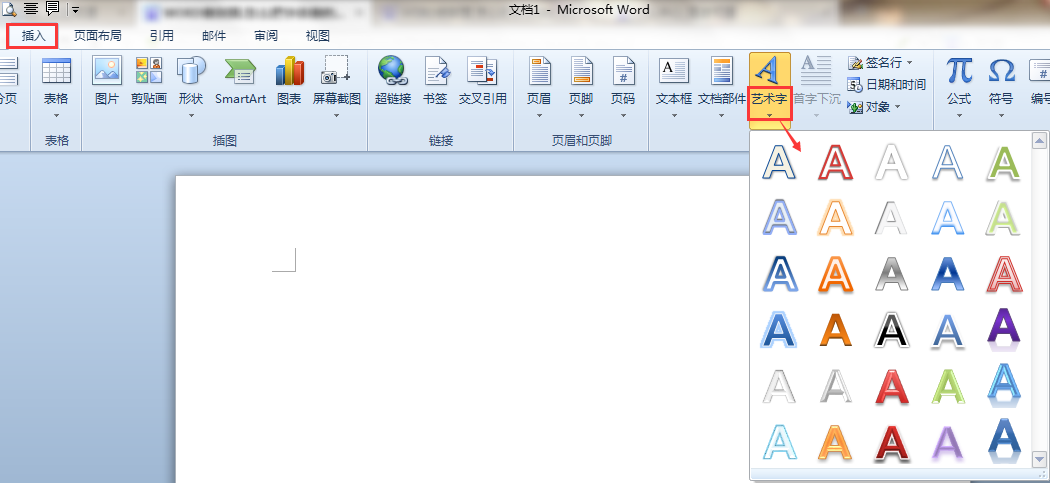 1、单击插入---->艺术字,在下拉选项中选择如图所示的艺术字样式;