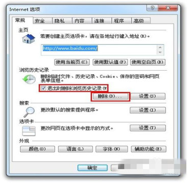 5、然后选择选项卡常规,选中退出时清除浏览历史记录,然后点击删除,根据需要选择要删除的内容,最后点击删除就可以了。