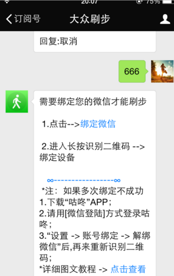 4、接着回复任意步数,出现提示,点击'绑定微信'。