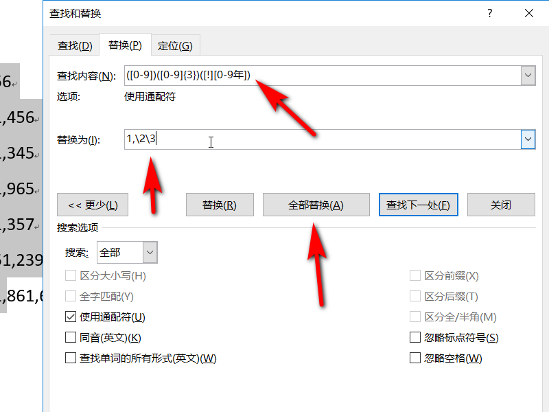 7、在查找内容中填入([0-9])([0-9]{3})([!][0-9年]),替换中填入:1,\2\3(注意:在输入法为英文半角的状态输入),然后再点击全部替换。