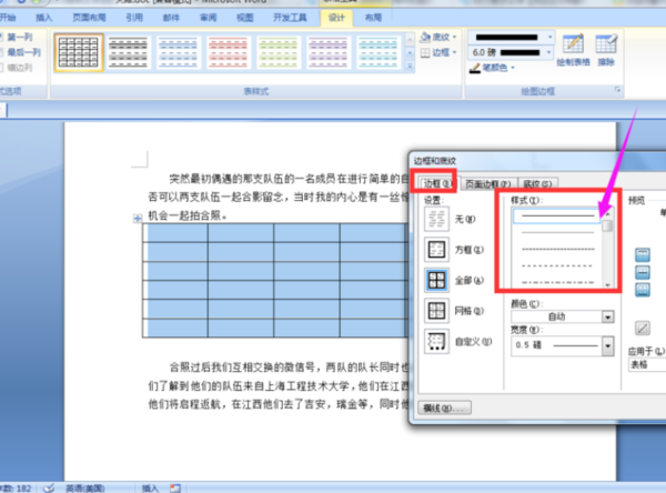 4、在打开的边框和底纹属性栏设置中,打开边框栏设置,右侧样式区选择一个合适的样式