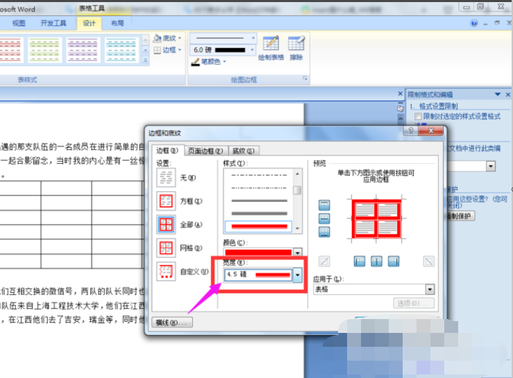 6、再往下宽度设置就是边框的粗细设置,数值越大边框越粗,右侧位置为预览效果区,选择好颜色和粗细后,点击确定
