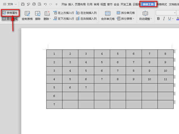 2、打开后,选中表格,点击菜单栏“表格工具”——“表格属性”进入。