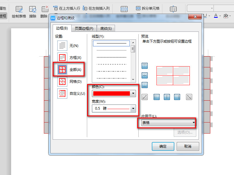 5、在“边框和底纹”边框中选择表格的颜色,如果只需设置表格内框的颜色,先点击“全部”将表格设置为红色,然后如图再选择“自定义”,点击选择颜色为黑色,如图在预览处将表格的外框线条点击一次,点击完成后确定。