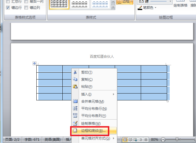 3、然后点击表格左上角的十字图标全选表格,然后点击鼠标右键,在快捷菜单中点击“边框和底纹”选项。