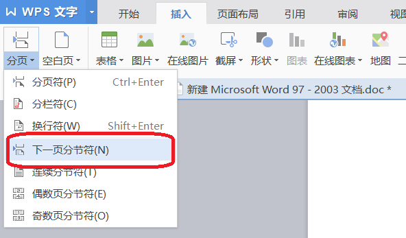 单击后会看到分隔符弹开的下拉框里,有”分节符“下面的”下一页“,左键单击。