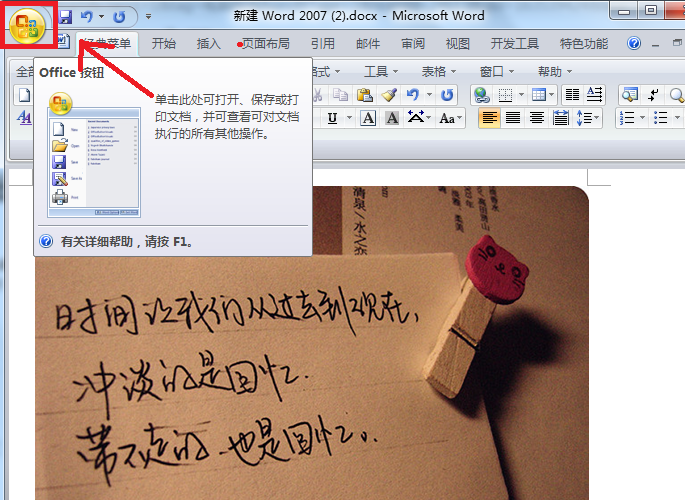 1、在电脑上打开需要保存图片的word文档,点击界面左上角的“Office按钮”图标。