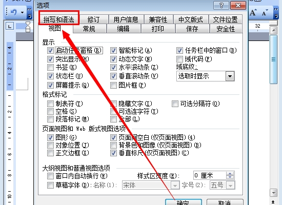 3、进入到选项里面走后,切换到拼写和语法的页面。