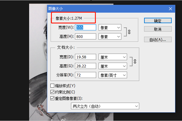 3、然后在弹出的图像大小设置框里可以看到目前该图片的像素大小等详情;