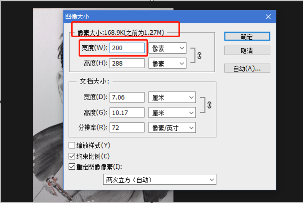 4、要缩小的话,可以直接在宽度一栏调整数据,因为选择了约束比例,高度和像素大小会随着宽度的改变而改变;