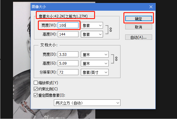 5、如把宽度改为100后,就会看到像素大小变为42K左右了,比原来的小,这时点击右边的确定按钮,然后保存图片则可。