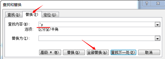 1、删除。快捷键“Ctrl+h”唤出替换对话框,“查找内容”处填“^p”,“替换为”处为空,然后点击“全部替换”即可。