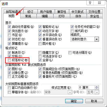 第2步,在打开的“Word选项”对话框中切换到“显示”选项卡,在“始终在屏幕上显示这些格式标记”区域取消“段落标记”复选框,并单击“确定”按钮;