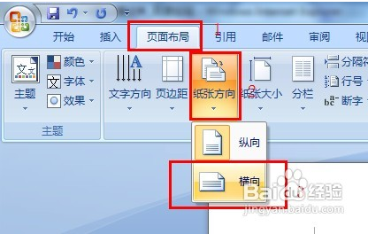 5、在工具栏中的“页面布局”的“页面设置”模块下,找到“纸张方向”,在下拉菜单里选择“横向”。