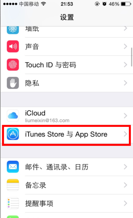2、进入设置后,下拉菜单找到“iTunes Store 与 App Store”一项,点击进入。
