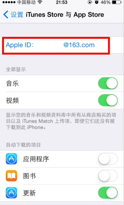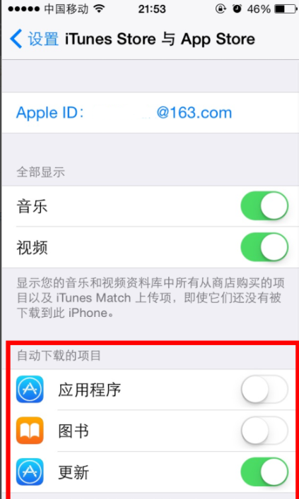 3、进入iTunes Store 与 App Store后,找到“自动下载的项目”一栏,将“应用程序”、“图书”和“更新”三项的开关都关闭。