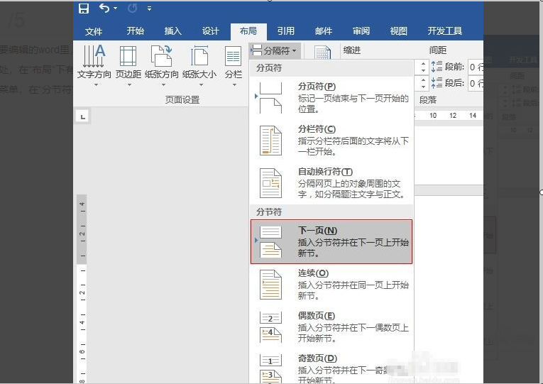 2、选择“插入-分隔符”,打开“分隔符”对话框,在“分隔符类型”下单击以选中“下一页”复选钮。