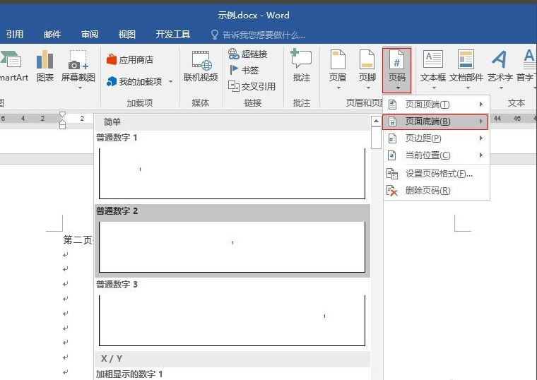 2、光标还是在第二页首字符处,在“插入”菜单下,有个“页码”选项,选择“页面底端”。