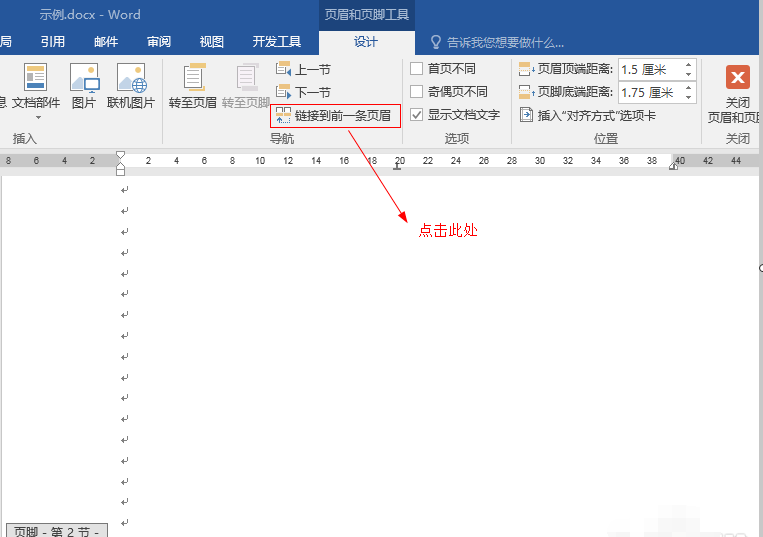 ④在页眉页脚的工具栏中单击“链接到前一个”按钮(也就是取消“链接到前一个”);