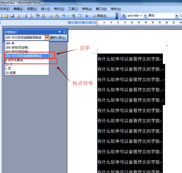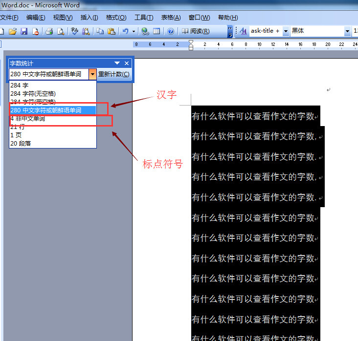 word有字数统计,选你要统计的段落,点:工具-字数统计