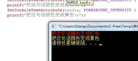 SetConsoleTextAttribute(handle,FOREGROUND_INTENSITY|FOREGROUND_RED|FOREGROUND_GREEN);//设置为黄色