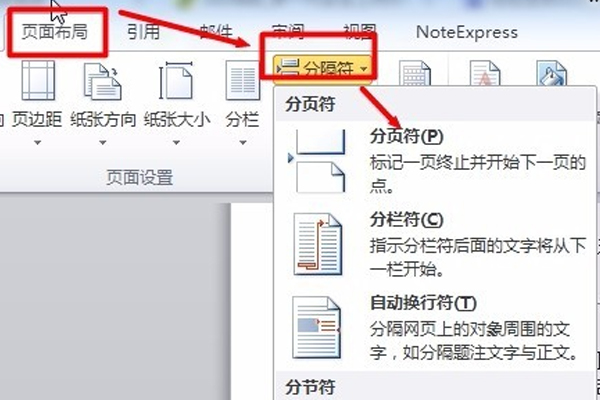 2、还可以通过“页面布局”选项卡里面的“分隔符”,点开“分隔符”,选择分页符,也可成功插入新的一页;