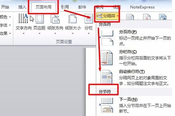 1、将光标放在第4页的首部,单击页面布---->分隔符---->分节符---->下一节,如图所示;