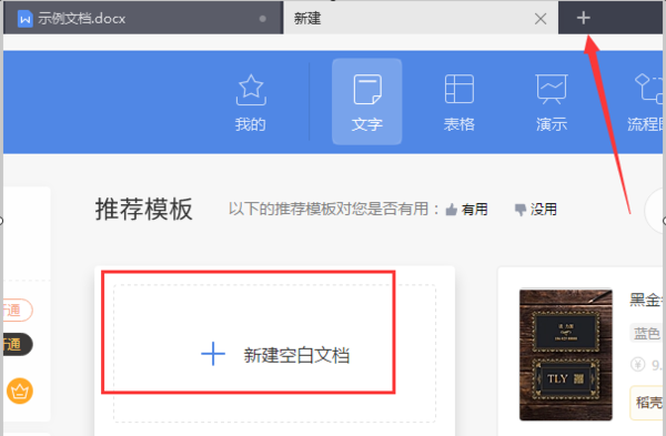 4、点击文档上方的+号选项并在弹出的界面中选择新建空白文档选项,新建一个空白的文档。