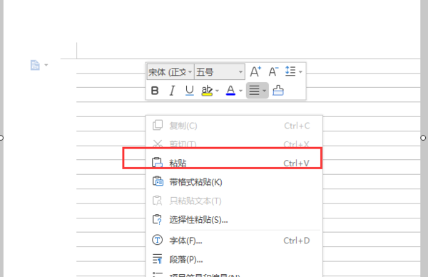 5、在新建的文档中鼠标右击空白文档中的任意部分并选择弹出对话框的粘贴选项将刚刚剪切过的内容粘贴到该空白文档中,这样就能降这一部分内容作为一个独立的文档分割开来。