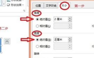 6、从弹出的窗口冲选择“大小”,把“高度”的“绝对值”和“宽度”的“绝对值”都设置为2厘米。这里同样是为了方便看才设置为2厘米,平时使用时的绘制我们视具体情况而定。