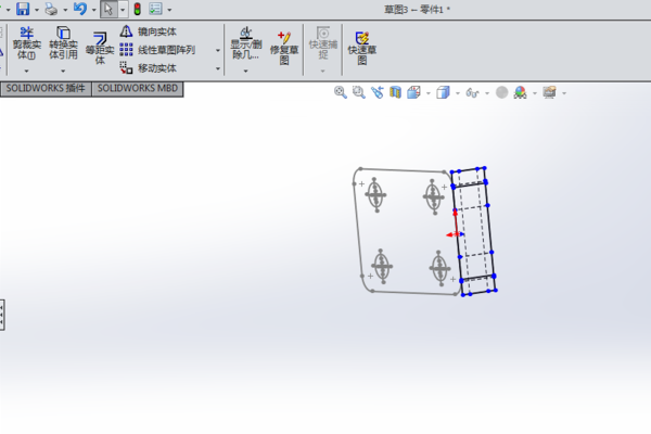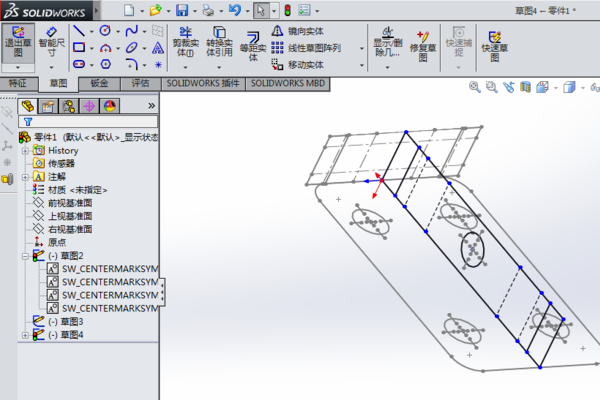 3、框选前视图,进行复制,在建模界面,选择前视基准面进入草图,选择粘贴。将视图右侧中点移动到原点和重合。