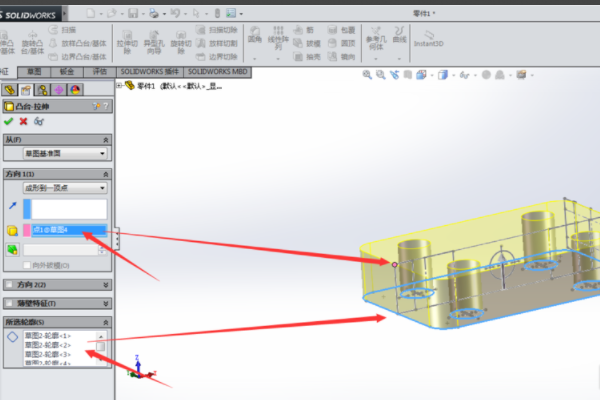 6、选择拉伸凸台命令,选取前视基准面的草图,拉伸到顶点,选择俯视图顶点,观察图形特征。