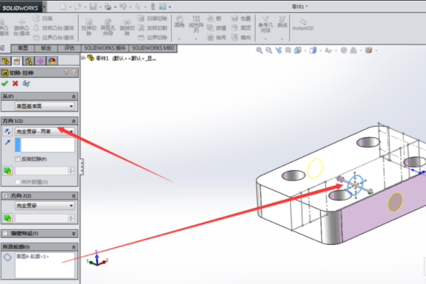 7、左视图中间都是隐藏线,俯视图中间有一通孔,选择拉伸切除命令,对该孔进行拉伸切除,选择两侧贯通。最后转为工程视图,选择左视图和俯视图显示隐藏线。检查与前面的CAD图一致,说明该零件实体正确。