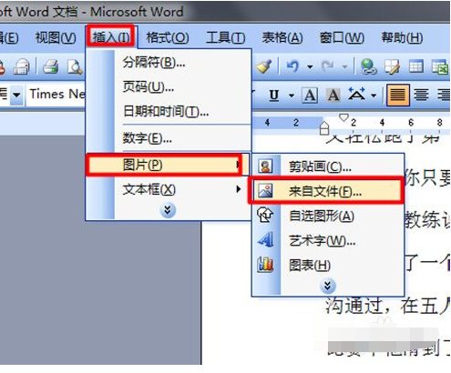 1、打开要编辑的word文档,依次选择【插入】--【图片】--【来自文件】