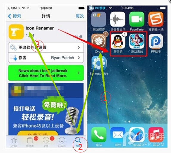 2、越狱完成后,打开Cydia商店,点击搜索icon renamer,安装。