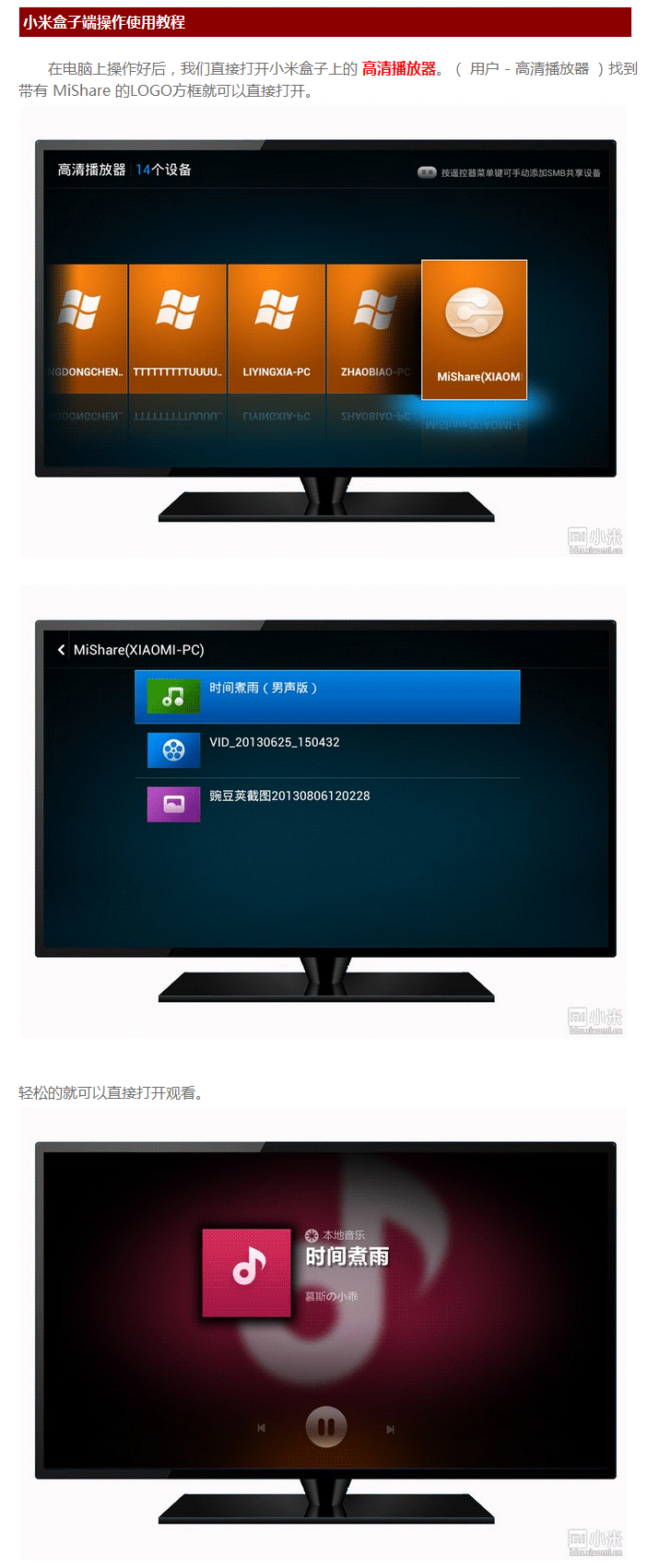 在电脑上安装完,到盒子上打开高清播放器,选择MiShare就能轻松播放啦。