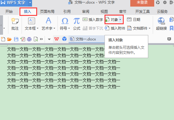 二、选择工具栏上的插入选项,在下面的功能项里向右拉找到对象功能按钮;