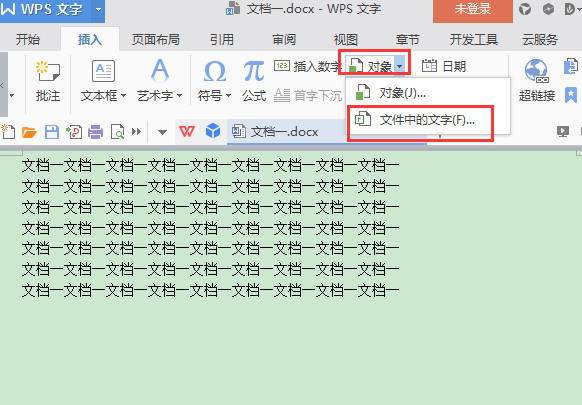 4.然后点击对象后面的下拉小三角,在出现的菜单中点击 文件中的文字 选项。