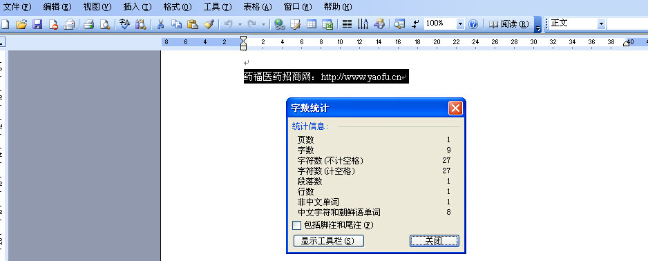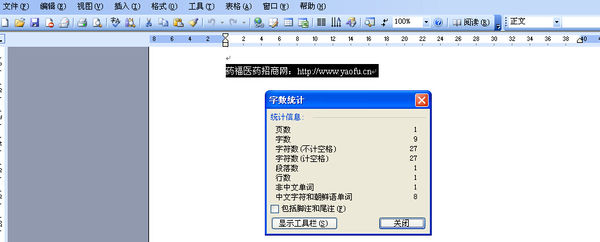 在字数统计窗口,点击左下方的“显示工具栏”就可以打开字数统计工具栏,之后在输入字符的时候就可以随时查看字数。