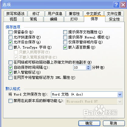 3、点击“保存”标签,选中“自动保存时间间隔”项,设置好时间,默认是10分钟,设置1-3分钟都可以,可以根据自己的实际需要设置时间,尽量短一点好些,如图。