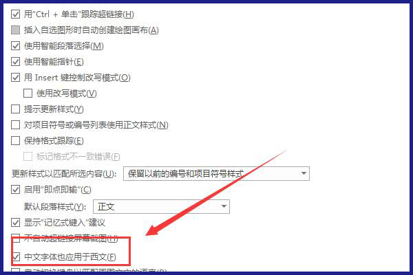 4、在高级设置界面中勾选中文字体也应用与西文,勾选之后保存即可,之后数字的文字格式以及字间距会和中文一致。