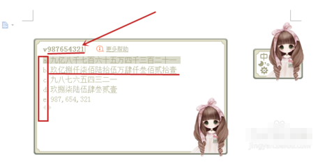 4.键盘输入“v”后紧接着就可以直接输入你要输入的大写的数值了,如“987654321”,就会显示“abcde”5中输入形式,我们要选择的是金额大写“b”,“e“也是较为常用的金额小写的输入(有的文档金额小写逗号隔开好辨认)。