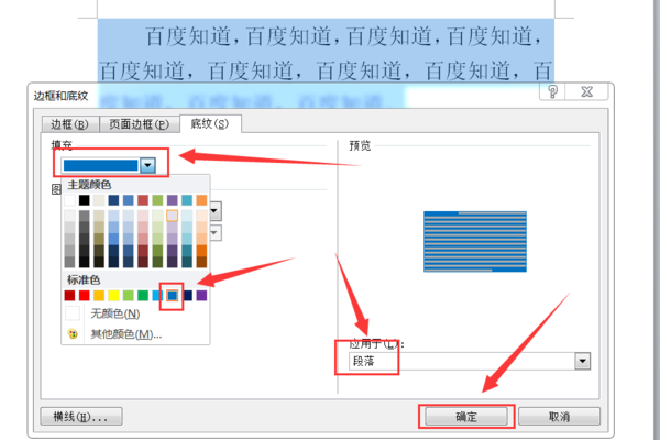 4、点击“填充”下方的选择框,在选项卡中选择“蓝色”,点击“应用于”下方选择框,选择“段落”,然后点击下方的“确定”按钮即可。