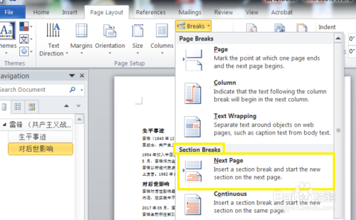 接下来,用我的方法添加附录。其实Word提供的方法的原理很简单。先看操作,回到第一步,这时,我们要在正文最后插入一个断点,把光标定位到正文的最后空白的位置(在尾注之前,假如你尝试在尾注最后定位光标,Word会让工具栏一些选项不可选)在工具栏的Page Layout下面有一个Break项,点开它右下角的小倒三角,选择section break下面的next page。如图所示。我们看到添加断点之后的效果跟第二步类似,但其实另有玄机。