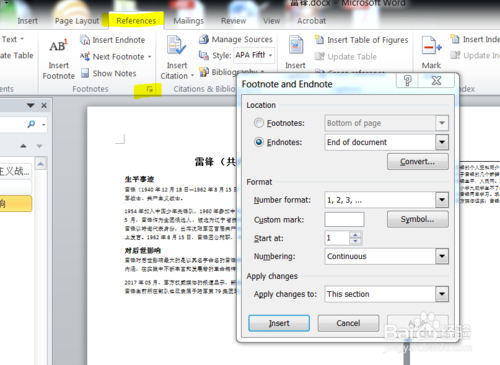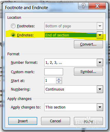 这时候我们点开“引用”右下角的小箭头,出现一个对话框,如图。点开Endnotes下拉框,选择“end of section”,再点应用,然后关闭对话框,如果前面一切顺利的话,那么现在效果就出来了,可以在尾注后添加“附录”,如图所示。