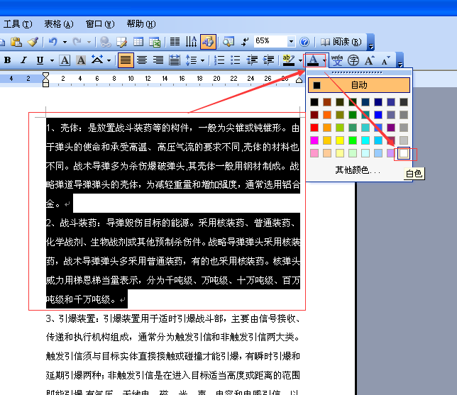 1、假设第一次打印了第一段和第二段,现在要续打第三段和第四段。先选择第一段和第二段,点击菜单栏字体颜色图标“A”,在下拉菜单中选择“白色”图标;