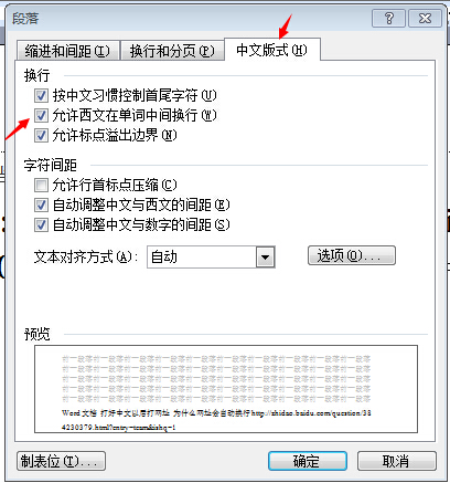 在段落设置窗口,点击“中文版式”选项卡,勾选“允许西文在单词中间换行”即可。