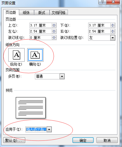 如将第3页设置为横向,方法是:在第3页前和第3页后分别插入一个连续的分节符(页面设置--分隔符--连续),打开”页面设置“对话框,设置纸张方向:横向,应用于:本节(这一点特别重要),确定。