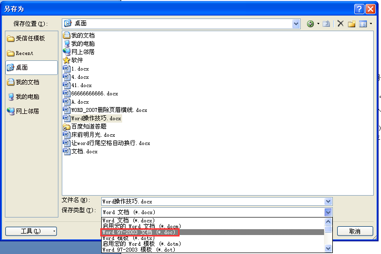 3、弹出另存为对话框,在文件类型处选择Word97-2003文档即可,如图所示。