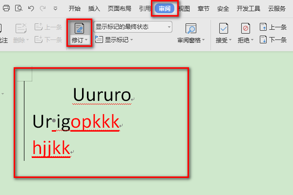 2、接上一步,文档进入“修订”状态,随机修改文档。在修订模式下,新增字体显示为红色加下划线,修改段落左边有竖线。